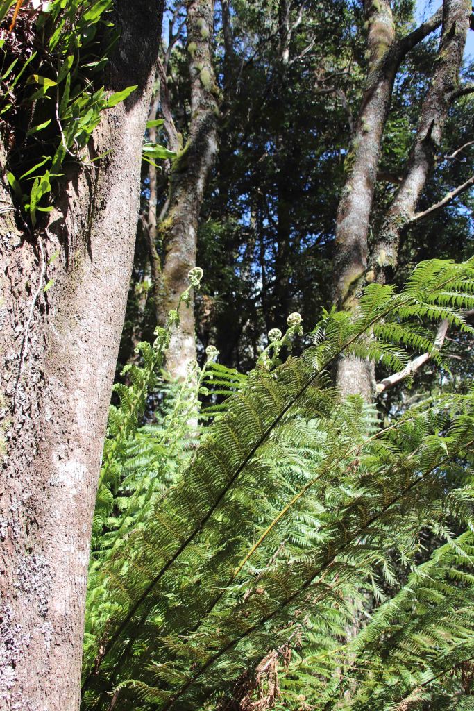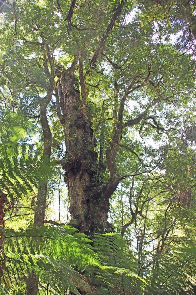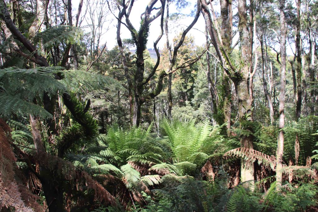 Insgesamt gab es sehr viel Landschaft und auch sehr viel Landwirtschaft. Aber plötzlich kamen wir in eine Art Bergwald und der Charakter der Pflanzen änderte sich rasch und deutlich, es gab beispielsweise viele Baumfarne ! Und es gab die Möglichkeit, einen kurzen Rundweg in einem Rest Regenwald zu machen. Was für ein Unterschied zu den Eukalyptuswäldern: Neben den Baumfarnen ist die sogenannte Südbuche (Nothofagus, in Tasmanien Myrtle genannt) eine Charakterart, riesige Bäume, die weitläufig mit unseren Rotbuchen verwandt sind. Es ist deutlich feuchter, Farne bewachsen auch die Baumäste.