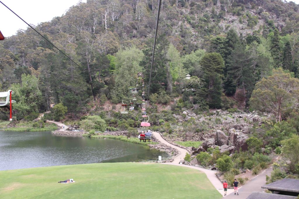 Übernachtung südlich von Launceston (zweitgrösste Stadt in Tasmanien) nahe der Nordküste, toller Campingplatz (es gibt sie also doch…), in der zweiten Nacht hatten wir sogar einen Platz am Flussufer ! Tagsüber stand eine Fahrt mit einem Sessellift über eine Schlucht mit anschliessender Wanderung auf dem Programm, jedenfalls haben wir das geglaubt. In Wirklichkeit handelte es sich um eine Art Mini-Disneyland mit einem ultralangsamen Sesselliftchen, das waagerecht über ein Schwimmbad und einen kleinen Fluss schwebte (max. 2 km/h).