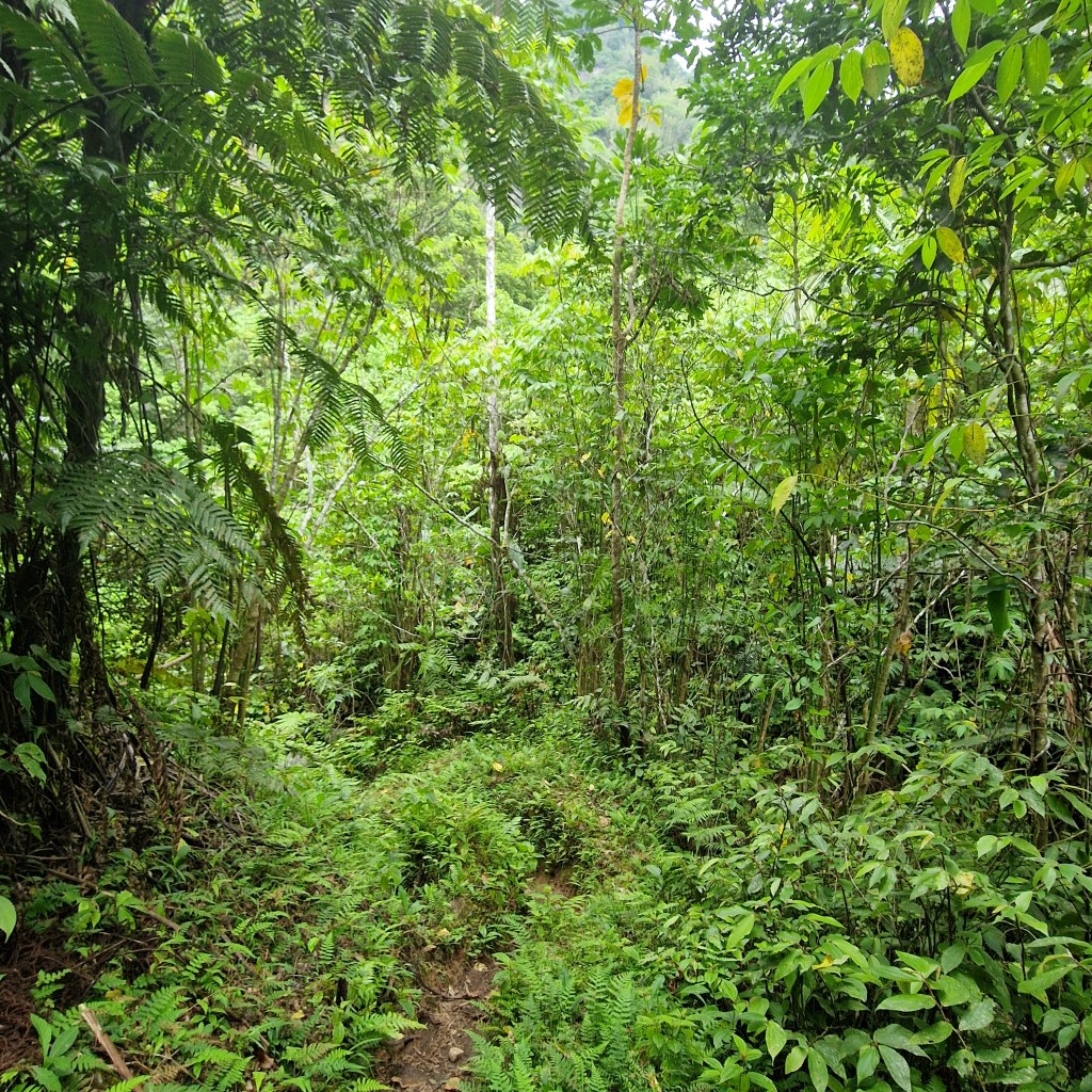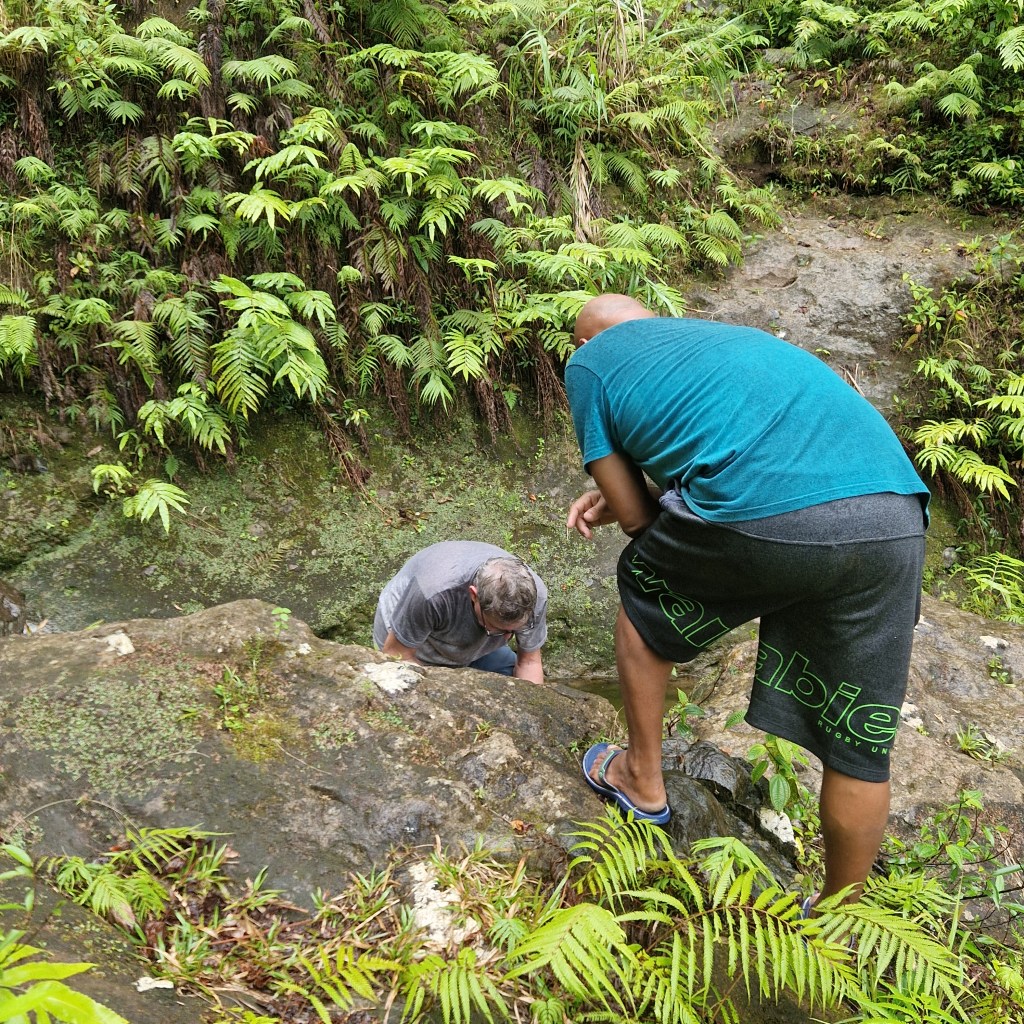 AJ trank noch ein wenig Wasser aus dem Bach und leider verlor er dabei einen seiner Flip-Flops, nun hatten wir einen einseitig beschuhten Guide, was ihm aber keine Probleme bereitete. Aufgrund des Regens gingen wir recht rasch weiter, querten den Bach, kletterten wieder über ein paar Felsen steil nach oben, danach wurde das Gelände wieder offen.
