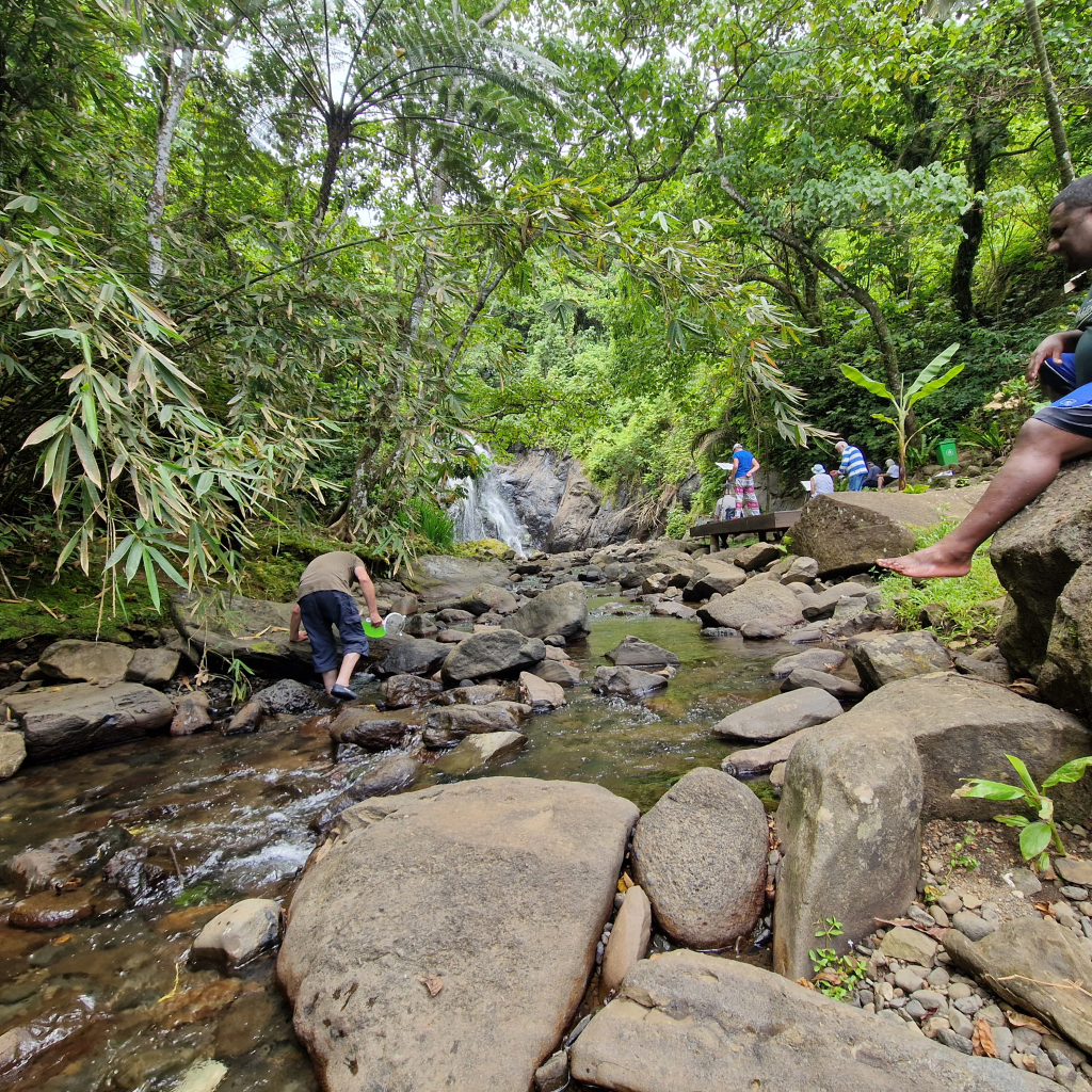 Am ersten Tag mit dem neuen Auto waren wir ja wie berichtet auf dem Hibiskus Highway unterwegs und am zweiten Tag in die Gegenrichtung. Wir wollten Wasserfälle besichtigen. Unterwegs fanden wir einen tollen Rastplatz mit Cafe und wunderbarer Aussicht über die Bucht von Savusavu (gegenüberliegende Seite der Bucht von unserem Hotel), betrieben von einer Dorfgemeinschaft (Urata).