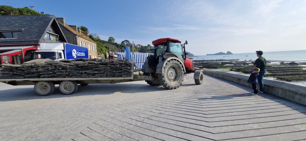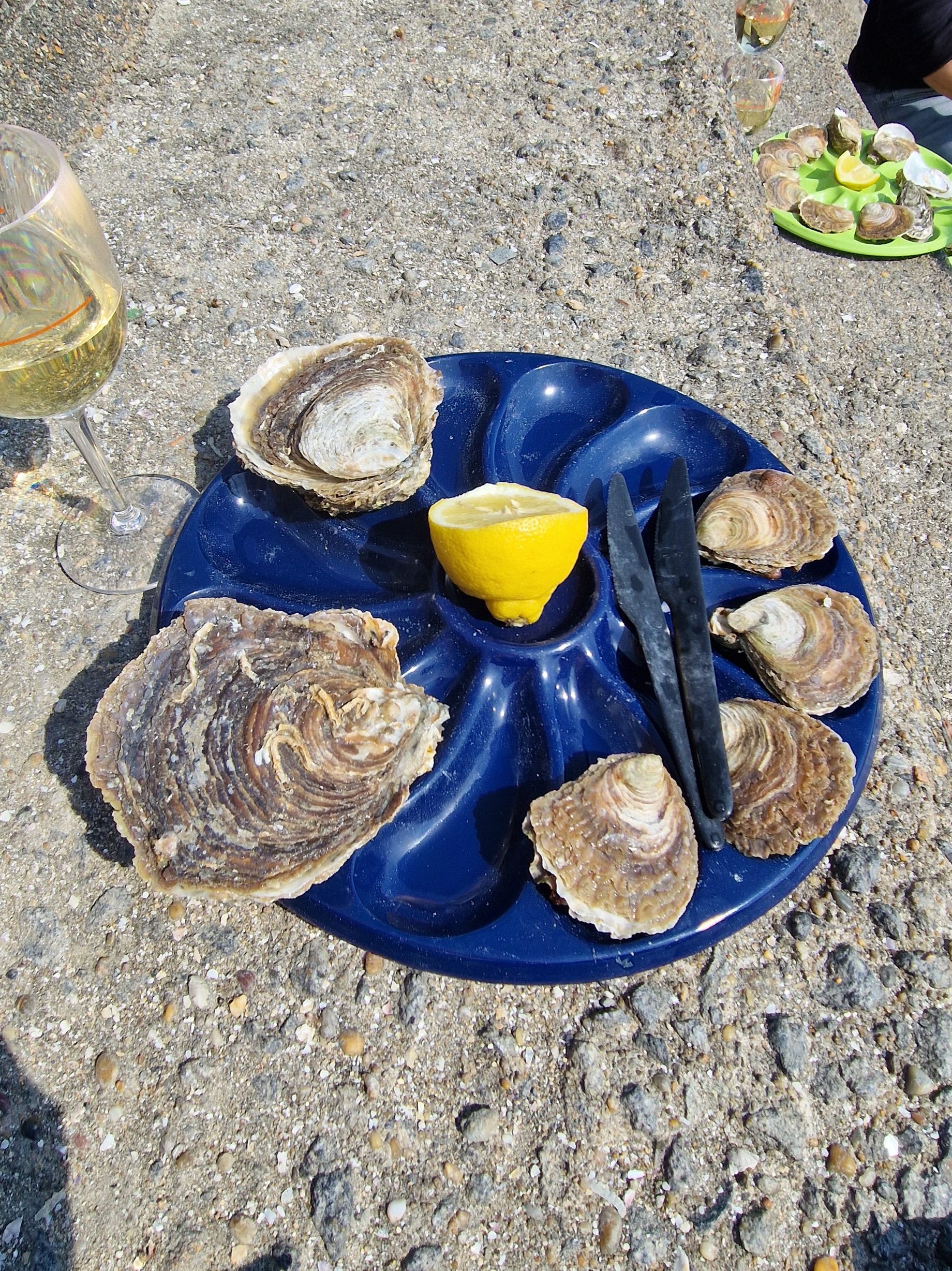 Die Huitres plates sind für uns überhaupt nicht zu sehen, sie sind ja am Schlick. Diese werden ebenfalls mit Zahlen im Namen angeboten, auch hier gilt, je tiefer die Nummer, desto mehr Muschelfleisch gibt es, desto älter und teurer sind sie. Hier gibt es noch eine Besonderheit: die Huitres „pied de cheval“ (übersetzt Pferdefuss): diese sind mindestens 15 Jahre alt und werden im Stück und nicht im Duzend bestellt.
