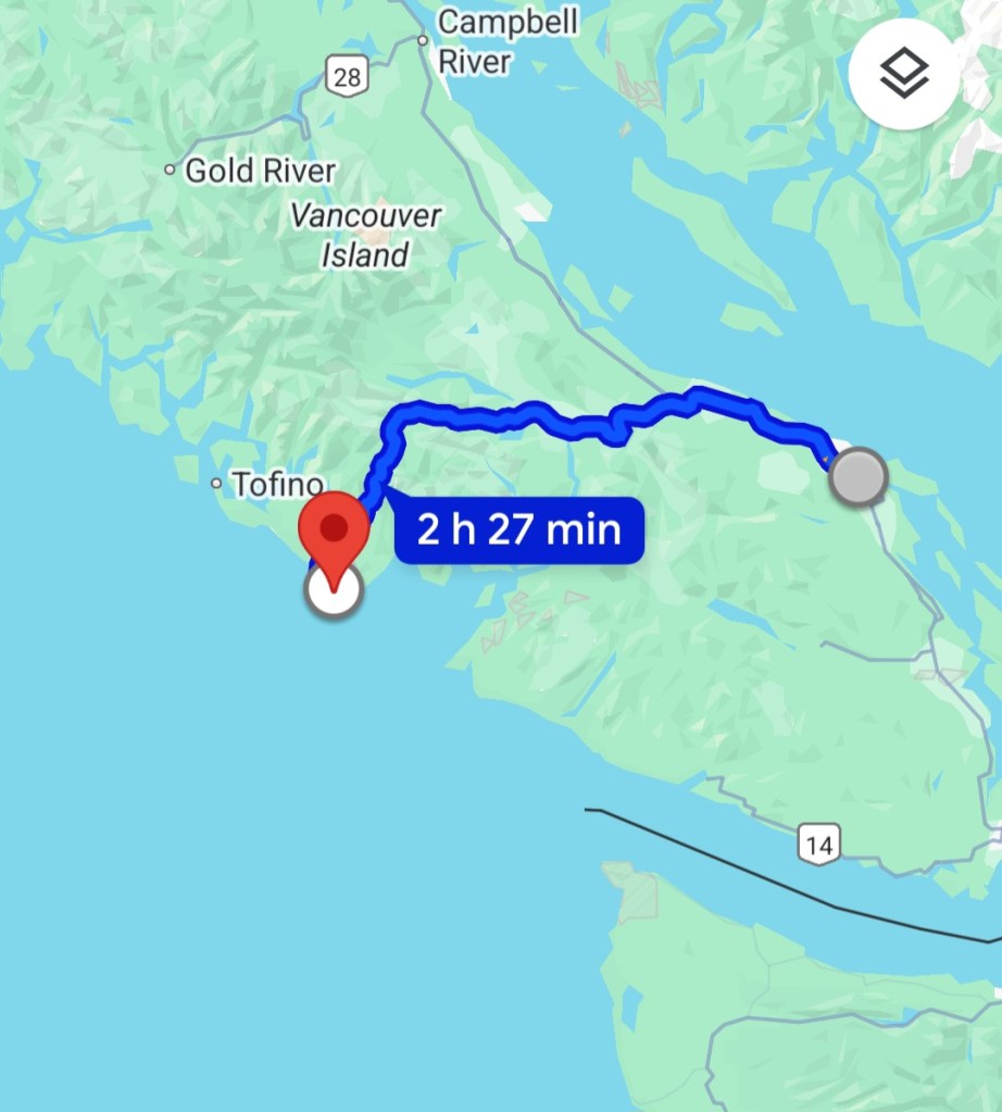Unsere Tour von Nanaimo nach Ucluelet, ca. 200 km durch eine gebirgige Landschaft.