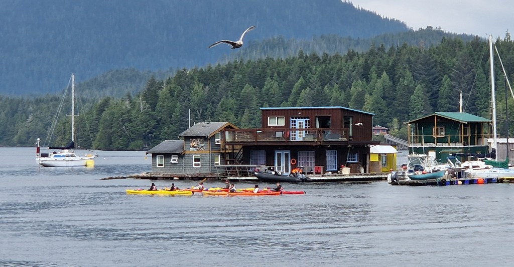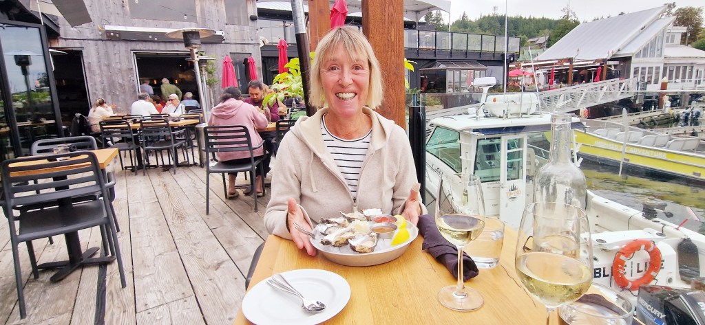 Nach der Bootsfahrt von 08.00 – 12.00 fuhren wir nach Tofino. Es hiess, dieser Ort wäre die noble Version von Ucluelet. Erstmals sahen wir vom Ort nicht viel, es war viel Wald mit Zufahrten zu einzelnen Resorts und Häusern. Erst gegen Ende der Strasse öffnete sich die Sicht auf den Hafen. Und hier gingen wir dann im „Shelter“ zum Mittagessen.