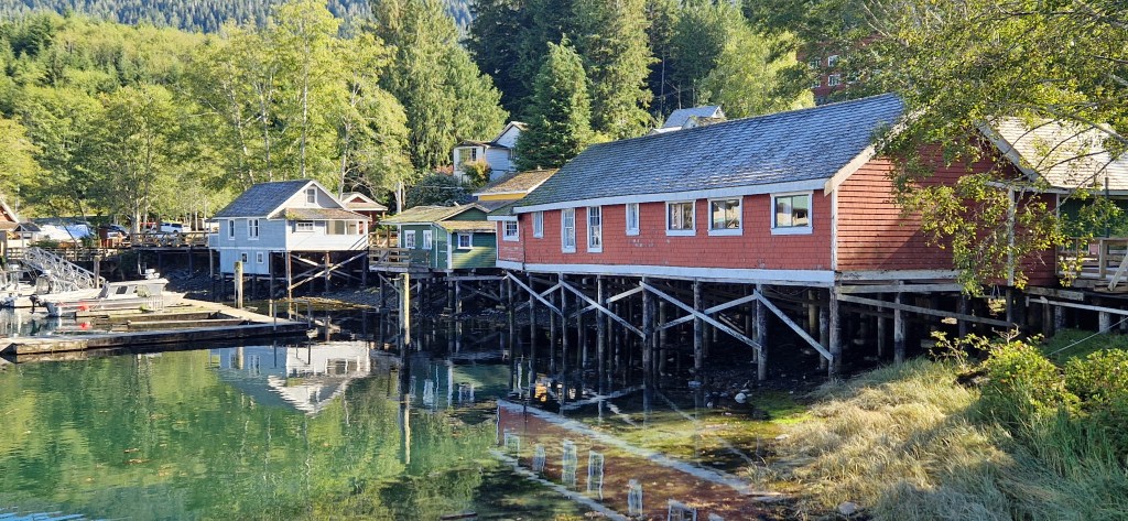 Was für eine wunderschöne, kleine, geschützte Bucht ! Das meiste sind historische, einfache Holzhäuser, ergänzt durch neuere Holzhäuser im alten Stil. Einige der neuen Häuser (Pub, Restaurant und Büros von 2 Firmen für Naturbeobachtungen) sind leider im Dezember 2024 abgebrannt und werden derzeit wieder zusammen mit einer neuen Plattform am Ufer wieder aufgebaut.