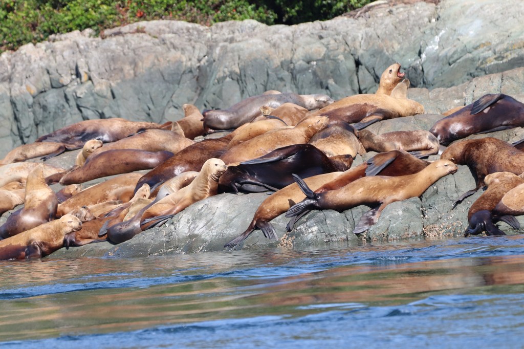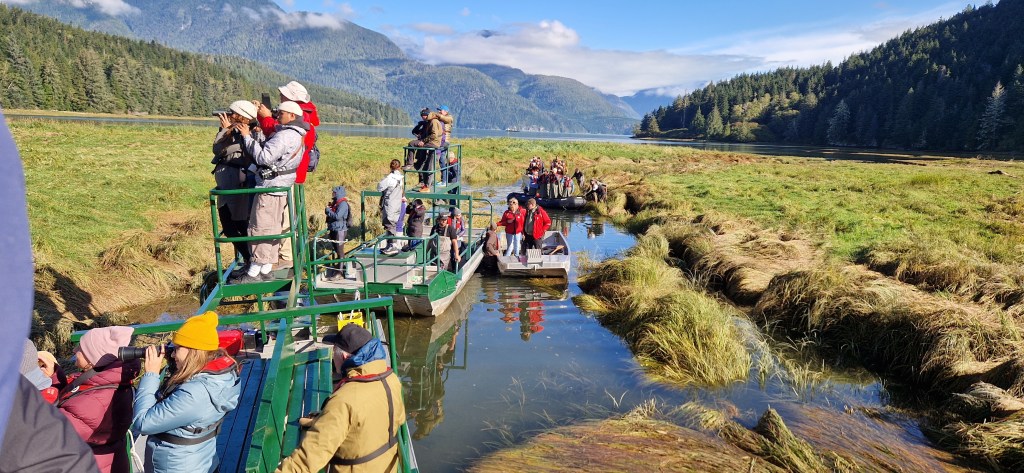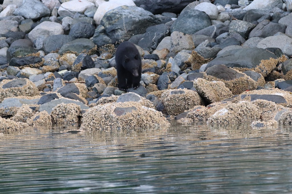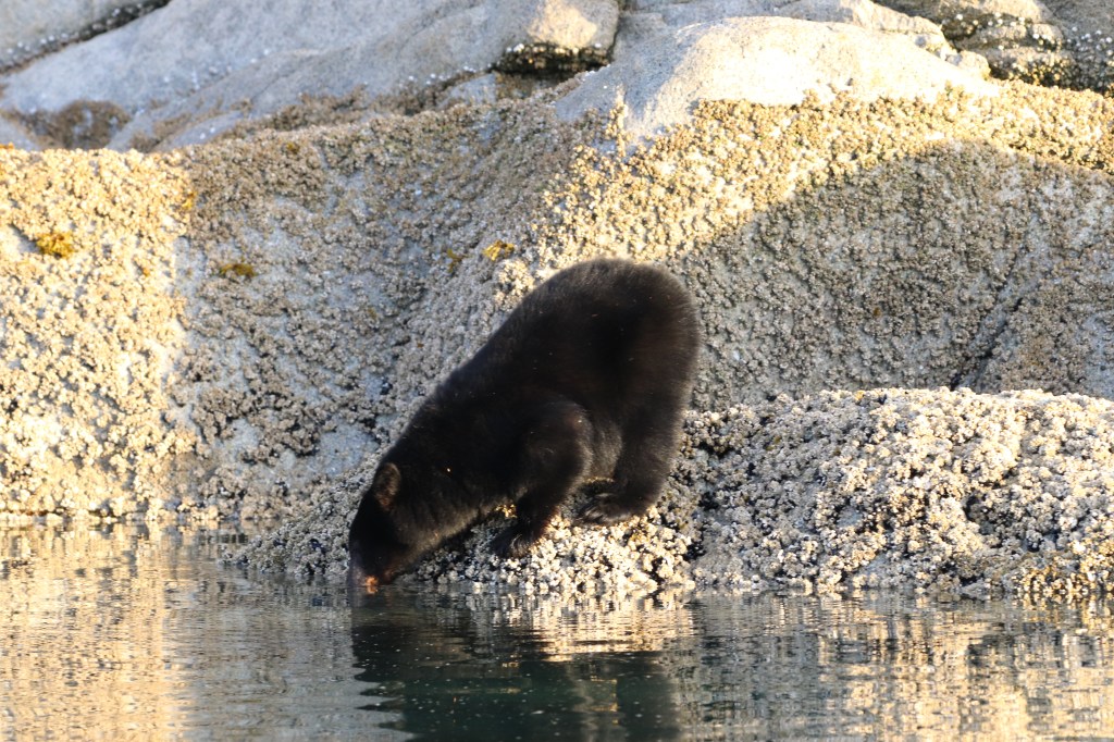Man fährt ca. 2 h auf die gegenüber liegende Festlandsseite in den Knight Inlet hinein (im Prinzip lange Fjorde zwischen den Landzungen, mit türkiesblauem Wasser und reich an marinem Leben). Der Inlet ist über 100 km lang, wir werden bis zur Hälfte fahren. Am Beginn des Inlets könne wir einen Halt bei einem Schwarzbären machen.