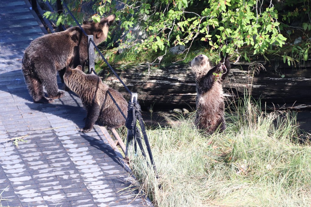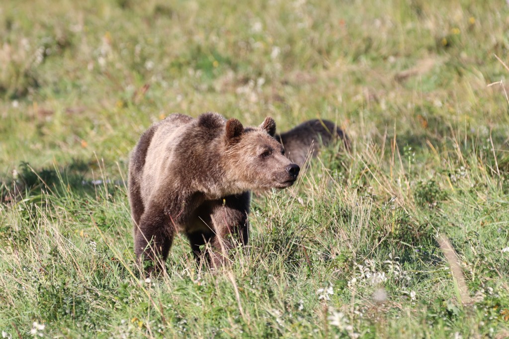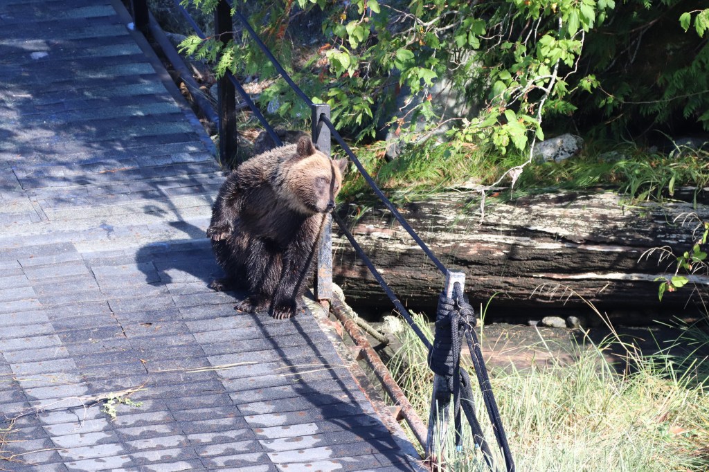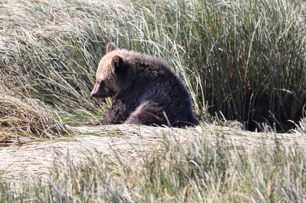 Prinzipiell zur Bärenfotographie: diese stellt sich einigermassen schwierig dar. Die Schwarzbären sind so diffus bezüglich der Belichtung, sie „verschwimmen“ regelrecht mit dem Hintergrund. Die Grizzlys sind in dieser Beziehung leichter. Jedoch, was beide Bärenarten gemeinsam haben, sie sind ständig mit Nahrungsaufnahme beschäftigt, haben also ständig die Schnautze nach unten, sehen also eher aus wie dicke Kühe. Bilder von einem Gesicht eines Bären brauchen geschätzte 40 Fehlversuche, bevor einer gelingt und dann ist dieser nicht immer scharf. Ein guter Grund, tiefer in die Fotographie einzusteigen ☺️